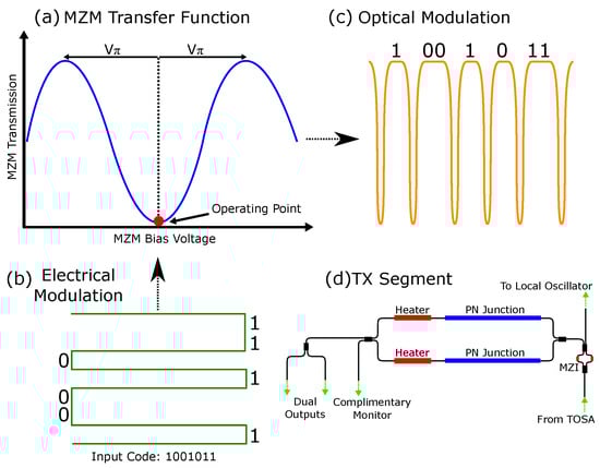 The Mach–Zehnder modulator (MZM) plays a pivotal role in transforming the electrical modulation code into optical modulation. This transformation is accomplished by modulating the depletion regions in the PN junctions of the MZM arms, as depicted in Figure 2. To enhance efficiency, a push–pull configuration is employed, effectively doubling the applied drive voltage. This method enables the attainment of the essential voltage swing for phase modulation, ensuring it is achieved with the least possible power consumption. To ensure that the MZM consistently operates at the required operating point, as depicted in Figure 2a, thermal heaters are integrated into each arm of the MZM. These heaters enable fine-tuning of the MZM output, thereby maintaining continuous and stable phase modulation.