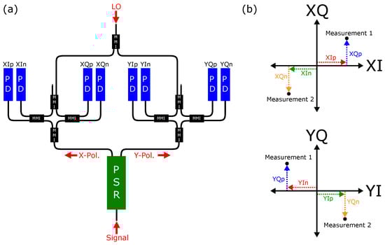 (a) Single channel polarization-diverse in-phase/quadrature (IQ) receiver (XIp, XIn = x-polarization in-phase pair; YIp, YIn = y-polarization in-phase pair; XQp, XQn = x-polarization quadrature pair; YQp, YQn = y-polarization quadrature pair; PSR = polarization splitter/rotator; PD = photodiode; LO = local oscillator). (b) X/Y polarization constellation diagrams. Two example measurements are shown with their component breakdowns, which are labelled on the receiver.