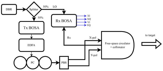 The recovering polarization from the received LIDAR signals can be accomplished with several methods [14,17,24]; however, in this work, we use a polarization-diverse homodyne receiver, similar to the work in the digital self-homodyne receiver shown by Puttnam et al. [25], but combining transmit circuit on the same chip as the receive circuit, which we call a bi-directional optical sub-assembly (BOSA). The purpose of the BOSA is to generate transmition signals in an optical fiber, and then to receive the reflected light in an optical fiber. The actual collimation into free space towards the target requires an optical telescope as well as an optical circulator to separate the transmit and receive optical signals in a coaxial LIDAR; this is detailed in Section 4.