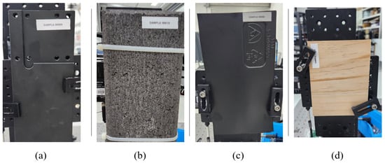 Materials used for experimental validation: (a) coated aluminum, (b) concrete, (c) black plastic, (d) engineered wood.