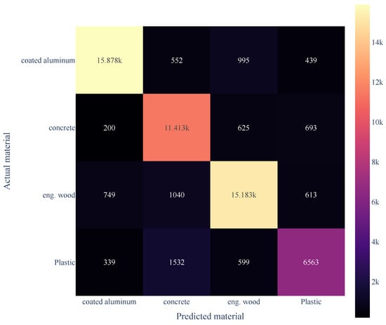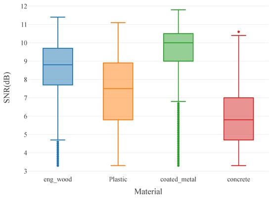 We believe that the cause of this lower accuracy for black plastic is not related to the characteristics of the material, but from the amount of measurement data in building the classifier. From the confusion matrix in Figure 6, we can see that the number of samples available for each of aluminum, concrete, and engineered wood (n = 17,864, 12,931, and 17,585, respectively) was much higher than the number of samples for black plastic (n = 9033), which produced a worse accuracy. This was expected as the number of available measurements from black plastic was much lower, thus the material classifier was biased against black plastic. This is due to the low reflectivity of the material, and in the future, a classifier should be trained on an equal number of points for every class. The difference in SNR for each material class is shown in Figure 7.