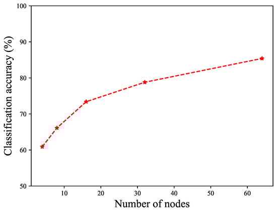 To explore the performance of the classifier with the hidden node number of neurons, we repeated the training and validation for a selection of hidden layer sizes, and measured the overall classification accuracy, as shown in Figure 8.
