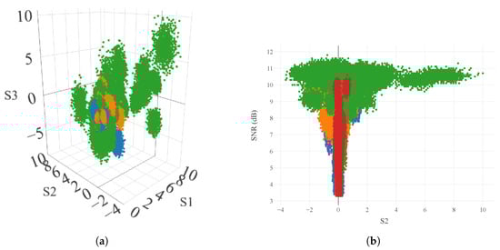 Additional insight is available by plotting the relationship between SNR and the Stokes parameters. In Figure 7, there is an observable difference in the mean SNR of each material, though the overall distributions are not separated; in Figure 9b, we see a clear distinction between concrete and the other materials, as concrete is strongly confined in S2, but greatly dispersed in SNR. Similarly, we note that coated metal only has measurement points above SNR > 8 dB.