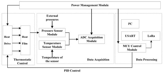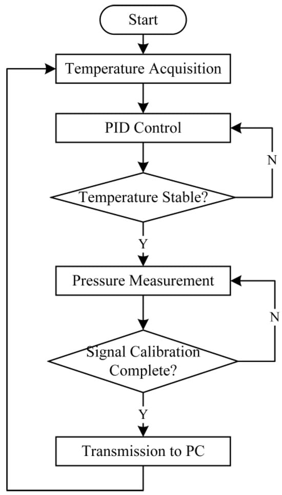 The algorithm flow of the system to collect the pressure sensor information and regulate it is shown in Figure 4. Firstly, the temperature data is collected, and the heating circuit and constant-temperature PID algorithm recognize the temperature compensation. When the temperature is stabilized to the target value, the pressure sensor information is collected, filtered, and optimized by recursive filtering and least squares. Then, the static characteristics of the sensor and the temperature drift performance after thermostatic compensation are tested and transmitted remotely using the LoRa module.