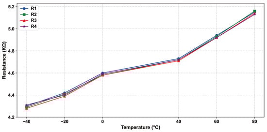 MEMS piezoresistive pressure sensors utilize the piezoresistive effect of silicon to convert the external pressure into a resistance change, which is converted into a voltage signal through a Wheatstone bridge circuit, which is a circuit consisting of four resistors that are connected diagonally two by two to form a closed loop [19]. In MEMS pressure sensors, two of the four Wheatstone bridge resistors are piezo resistors located in the strain film of the sensor, whose structure is shown in Figure 2a. When the sensor is pressurized, the strain film deforms, resulting in a change in the resistance of the piezoresistor, and this change breaks the balance of the bridge, resulting in a voltage difference across the diagonal of the bridge. When the temperature changes, the resistance value also changes at any time.