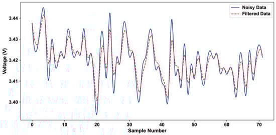 where , , j = 1, 2,…, i is the actual voltage value of the jth sample, is the voltage output after the recursive filtering process, i is the number of samples, is the weighting coefficient, and the values of i and n are derived from experiments. According to Equation (7), it can be seen that each sampled data contributes to the output data, and the weighting coefficient determines the size of the contribution. For the value of n, the larger the value, the stronger the anti-interference ability of the output data, but at the same time, it will make the convergence speed of the operation slower, and the number of calculations will be increased accordingly. Through experimental verification, when n = 16 and the number of sampling operations is 72 times, the ideal error of the filtered output data is minimized.