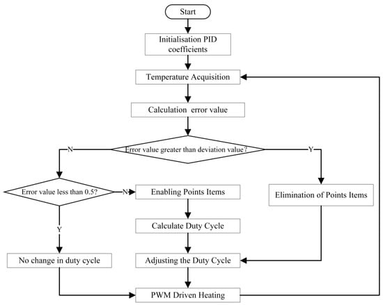 In practical applications, temperature data sampling occurs at discrete intervals, and the collected data are discrete values. Additionally, the data has storage limitations, making older data less valuable for reference. Due to the integral action, significant errors can lead to system output overshoot, causing temperature oscillations around the target value. When system errors are small, relying solely on proportional and derivative control often fails to eliminate the error quickly, which affects the system’s response speed and accuracy [30,31]. Therefore, in this design, the main record of an integral part of the deviation value within a certain period, and to improve the system’s stability and response speed, the integral separation PID control algorithm is used. Equation (9) indicates that when the system error is large, the integral control part is canceled, and only the proportional and differential control are retained to avoid the overshoot caused by the integral action. When the error is small, the integral control is reintroduced to reduce the static error and improve the system stability [32,33]. The flowchart of the improved PID formulation can be represented in Figure 6.