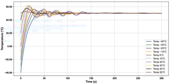 In this paper, we use the heating pad and PID algorithm to control the constant temperature of the pressure sensor chip, record the temperature of the pressure sensor when the temperature of the temperature box is set to −40 °C~50 °C in 300 s, and record the temperature value once every 10 s. According to the test data, the corresponding temperature control curve is plotted as shown in Figure 7, and the results show that under different temperature environments, the heating pad fluctuates for some time and tends to stabilize in about 150 s. The chip temperature is maintained at about 50 °C.