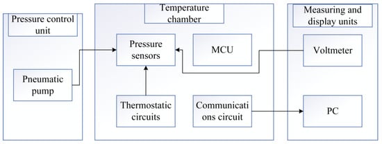 To meet the experimental requirements, a vacuum pressure pump was utilized, capable of generating pressures ranging from 0 to 500 kPa with an accuracy of ±0.008%. Given that the measurement pressure range for this experiment is 0 to 300 kPa, the pressure pump is suitable for the measurement needs. The temperature chamber offers a temperature adjustment range from −90 °C to 150 °C, with a temperature change rate of 2 to 5 °C/min and temperature fluctuations not exceeding ±0.5 °C. This temperature chamber boasts excellent performance, featuring intelligent operational management, a user-friendly touchscreen interface, and a variety of data interfaces. It can be networked with devices such as personal computers, making it highly suitable for laboratory temperature testing experiments. The pressure signal measurement circuit board operates in conjunction with the host computer to measure the voltage output from the pressure sensor. This circuit board is capable of measuring both pressure and temperature signals, controlling the temperature of the pressure sensor, and transmitting the measurement results to the host computer.