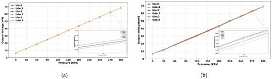 After addressing the static characteristic compensation, sensor temperature drift remained an issue. The same experimental platform was utilized to handle this problem. Without employing PID control for maintaining constant temperature, the temperature chamber was used to simulate various experimental temperature environments, while the pressure pump controlled the pressure environment for the sensor. Starting at 50 °C, the temperature was sequentially decreased in 10 °C increments, down to a minimum of −20 °C. The sensor’s output voltage was recorded under different pressure conditions at each temperature. Figure 14a illustrates the relationship between sensor output and temperature variations. A temperature of 50 °C was used as the reference temperature to analyze the sensor’s temperature drift characteristics. The thermal zero drift and temperature-induced thermal drift coefficients were calculated for each temperature point to quantify the sensor’s drift characteristics.