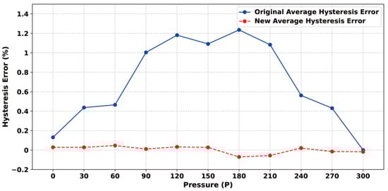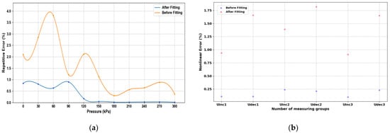 After the experimental platform was built, the static characteristics of the sensor were first measured and regulated, and the constant temperature was set at a higher level of 50 °C to meet the sensor chip and realize constant temperature control in various normal environments. The static characteristics of the sensor were obtained by changing the input pressure to obtain the output voltage value and extracting and calculating six sets of data, including three positive and three negative strokes. Figure 11a shows the input–output relationship before the least squares compensation, from which it can be seen that the output voltage of the sensor chip generally increases linearly with the increase in air pressure, and the calculated nonlinear error is 1.82% at maximum, the hysteresis error is 1.23% at maximum, and the repeatability error is 3.79% at maximum. During the measurement process, it is found that the output signal of the MEMS piezoresistive pressure sensor shows a certain nonlinear, and there are hysteresis errors and nonlinear errors between positive and negative strokes. In order to attenuate the impact of these static errors on the sensor’s performance, the data can be linearized using the least squares algorithm. Figure 11b shows the relationship between the input and output data after the least squares algorithm processing, showing that the positive and negative travel curves are closer after processing. Figure 12 represents the hysteresis error of the sensor before and after processing by the least squares algorithm, and Figure 13a represents the repeatability error before and after processing. Figure 13b represents the number of nonlinear errors before and after processing by the algorithm. It can be seen that after processing by the algorithm, the nonlinear error at 50 °C is reduced from the initial 1.82% to 0.24%, the hysteresis error is reduced from 1.23% to 0.046%, and the repeatability error control is reduced from 3.79% to 0.89%.