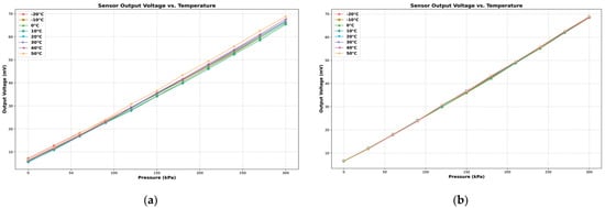 (a) Output curve after temperature compensation pressure sensor output voltage results at different temperatures without PID control; (b) Output curve after temperature compensation.