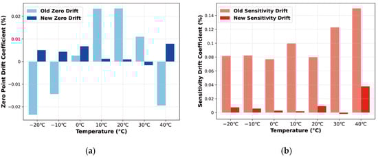 Thermal zero drift and thermal sensitivity drift before and after temperature compensation: (a) Comparison of thermal zero drift; (b) Comparison of thermal sensitivity drift.