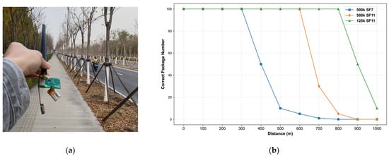 To test the communication distance of a sensor node using LoRa, the E22-400M22S module was employed. LoRa frames were transmitted and received in a straight line along a suburban road, and the test scenario is shown in Figure 16a. The transmission power was set to +22 dBm, with a center frequency of 433 MHz, and the antenna height was maintained at 2 m above the ground. The LoRa parameters were configured as follows: BW 500 kHz, SF11, CR4/5; BW 500 kHz, SF7, CR4/5; and BW 125 kHz, SF11, CR4/5. These settings correspond to receive sensitivities of −117 dBm, −128.5 dBm, and −134.5 dBm, respectively [34,35]. For each set of parameters, 100 packets were transmitted every 100 m, and the number of correctly received packets was recorded to evaluate the communication performance. The communication distance and results for different LoRa parameters are shown in Figure 16b.
