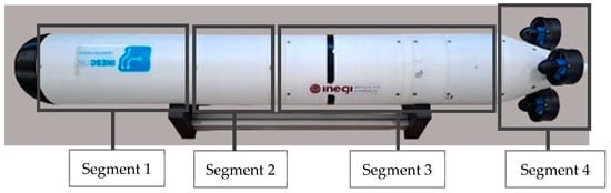 To investigate the potential benefits of a buoyancy-driven mechanism on energy efficiency, the authors developed a prototype featuring a VBM, as previously described in the literature [22] and presented in Figure 1. It should be noted that in standard operation, the prototype works with the main axis in the vertical direction. This prototype includes a main control unit (MCU—segment 1) for autonomous operation and is tailored for integration into autonomous underwater vehicles (AUVs) using modular building blocks or, alternatively, for standalone use as a buoy for vertical profiling or hovering tasks. In [2], a propeller module (PM—segment 4) was integrated into the prototype to allow for the comparison of energy consumption in real-world applications. The prototype also includes an intermediate section for floatation foam (segment 2) and the VBM (segment 3). Its overall dimensions are 1616 mm in length, 200 mm for the outer diameter, 180 mm for the inner diameter, and its dry weight is 36 kg. Segment 1 has a length of 400 mm, segment 2 has a length of 200 mm, segment 3 has a length of 616 mm, and segment 4 has a length of 300 mm. The black end cap seen at the left side of Figure 1 has a length of 100 mm. Buoyancy adjustment is achieved by pumping seawater via a diaphragm-sealed piston mechanism [22] driven by an electric motor coupled to a mechanical transmission and spindle. This VBM enables a total volume change of approximately ±350 cm3 and can operate down to a depth of 100 m. This prototype, which will be used in this work without any hardware changes relative to the one presented in [2], incorporates two sensors which are standard for this type of module: (i) a pressure sensor, which is used to determine the depth of the vehicle and (ii) a position sensor to measure the position of the diaphragm-sealed piston mechanism. This second sensor allows the estimation of the buoyancy force as it enables the measurement of the variable volume. Only these two sensors are required for the controllers developed in subsequent sections.