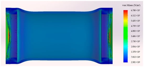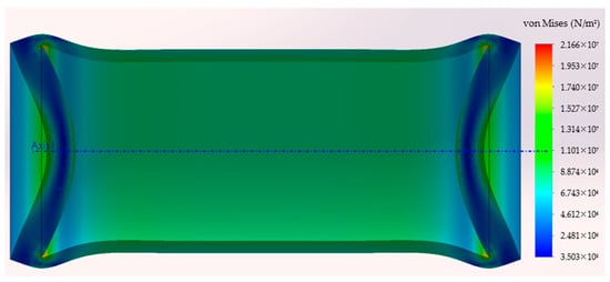 The deformed shape (amplified by a factor of 40 times) and the von Mises stress on the 3D model subjected to a 10-bar pressure load is shown in Figure 6. As performed with the VBM model, the true deformed shape was reimported to SolidWorks as a new part, and the new volume calculated. It was found that for a 10-bar pressure, the MCU loss of volume would be about 7 cm3. Finally, the parameter , the loss of volume per meter depth, was calculated as the sum of the volume loss of the VBM () and the volume loss of the MCU , at 100 m (10 bar of pressure):