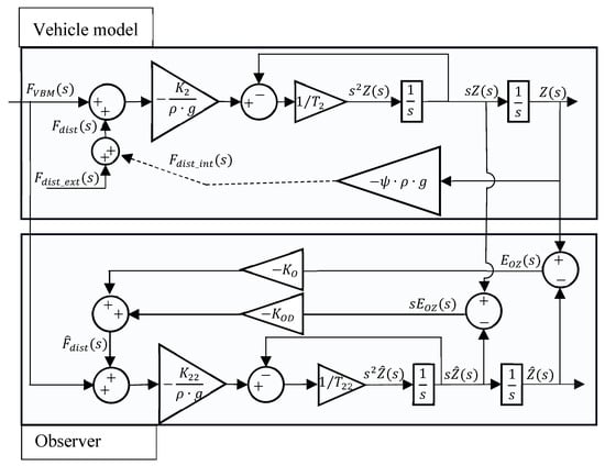 For the purpose of the disturbance observer synthesis, the disturbance force () that will be observed () is considered to be composed of two parts: an external one ) caused, for instance, by dropping or collecting a weight, and an internal one ), caused by the vehicle deformation due to pressure.