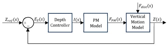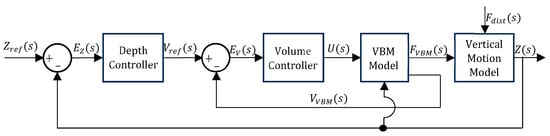 Figure 8 presents the block diagram for structures 3b and 7b. In Figure 8, is the target depth reference and is the depth error, whereas is the target volume reference and is the volume error. Figure 9 shows the block diagram for structure 11b, where is the control action and is the PM buoyancy force.