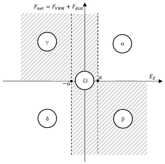 In the shaded regions of the schematic in Figure 11, the VBM is switched off, and in the remaining regions, it is switched on. If there are no disturbances present, is sufficient to characterize the prototype depth acceleration, since it is the only force that can change the prototype vertical motion equilibrium. In real-world conditions, there are countless possible disturbances that may occur during an underwater mission, such as load lifting, buoyancy trimming errors, and hull deformation, among others. This means that it is possible for a situation to occur where should lead to an expected output in terms of prototype acceleration, but the existence of does not lead to the expected prototype movement. To take into account disturbances, the vertical axis of Figure 11’s schematic represents the net force (). Parameter is a depth deadband, meaning there is an admissible depth error in which the controller is switched off (). Considering the system starts in region α, the depth error and net force are positive (). In this situation, the target depth reference is deeper than the current depth () but the positive buoyancy would lead to a decrease in depth, which would increase . For this reason, the VBM should be switched on in this case, so that . Since will directly act on the derivative of and so, on the derivative of (please check Figure 2), the value of will eventually become negative and the depth error will eventually decrease. A similar line of thought can be followed for region δ of Figure 11, while keeping in mind that in this region, the depth error and the net force are both negative. In regions β and γ, the depth error and the net volume have opposite signs; therefore, despite the VBM being turned off, the natural dynamics of the system will inevitably lower the error, leading the system to region Ω. The system cannot remain at a steady state inside region Ω, so it will eventually move to the other regions. From the description above, it is possible to infer that parameter has a direct influence on the steady-state error.