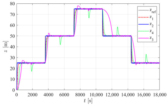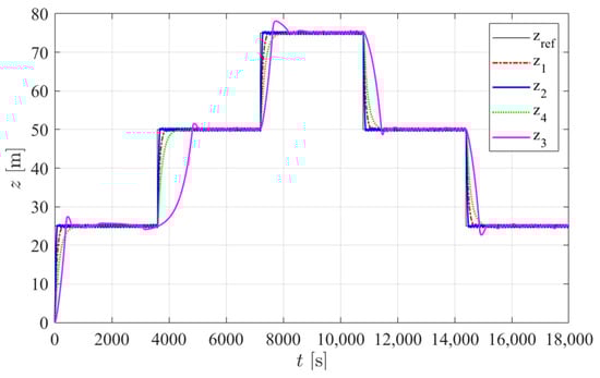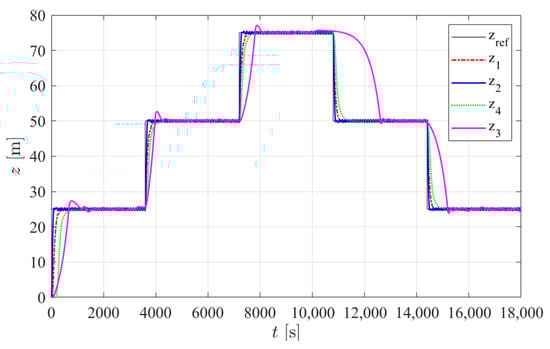 In this section, the VSC performance presented in Section 4 will be assessed. To that end, the performance of the VSC will be tested against (i) the PID-type controllers presented in [2] leading to the lowest energy consumption of the VBM (controllers 3b and 7b of [2]) and (ii) the PID-type controller leading to the lowest energy consumption of the prototype actuated by propellers (controller 11b of [2]). To simulate the VSC, it is also necessary to determine adequate gains for the disturbance observer. In the simulations, it was assumed there was no error in the estimation of parameters and . The observer gains were chosen so that all poles are real. Table 3 presents the values chosen for the simulation. Table 4 lists the observer pole locations.