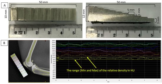 Characteristic of the density standard used. (A) Dimensional features: length, height, and width in mm of the entire cuboid and each step (S1–S10), respectively. (B) Radiomic features: reference attenuation of the X-ray beam in Hounsfield units (HU) for each step, with the ranges (minimum (Min) and maximum (Max)) of the relative density set for S1 (marked in yellow).