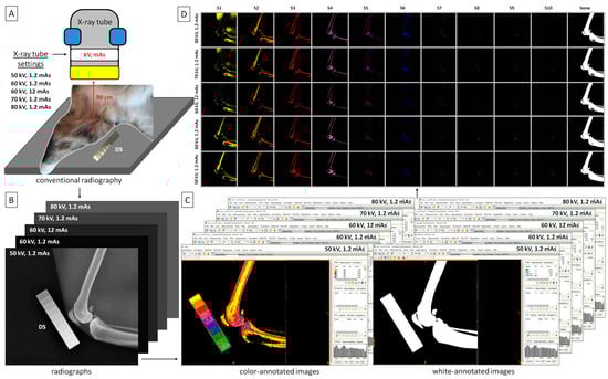 The characteristic of the applied computed digital absorptiometry (CDA) protocol. (A) X-ray tube settings used in this study. (B) Five radiographs obtained for the respective X-ray tube settings. (C) Color-annotated and white-annotated images decomposed from radiographs in relation to the range of the relative density of each step (S1–S10) of the density standard. (D) All decomposed images returned for a single knee joint.