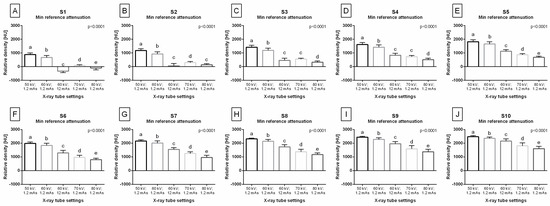 The minimum value (Min) of reference attenuation for each step of the density standard (S1–S10) compared between X-ray tube settings (50 kV; 1.2 mAs; 60 kV; 1.2 mAs; 60 kV; 12 mAs; 70 kV; 1.2 mAs; 80 kV; 1.2 mAs). Plots (A–J) show the Min reference attenuation for each step: (A) Min reference attenuation for S1; (B) Min reference attenuation for S2; (C) Min reference attenuation for S3; (D) Min reference attenuation for S4; (E) Min reference attenuation for S5; (F) Min reference attenuation for S6; (G) Min reference attenuation for S7; (H) Min reference attenuation for S8; (I) Min reference attenuation for S9; (J) Min reference attenuation for S10. The data are presented in Hounsfield units (HU) using the mean + standard deviation (SD). Lowercase letters indicate differences between the X-ray tube settings. The significance level was set as p < 0.05.