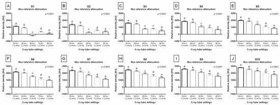The maximum value (Max) of reference attenuation for each step of the density standard (S1–S10) compared between X-ray tube settings (50 kV; 1.2 mAs; 60 kV; 1.2 mAs; 60 kV; 12 mAs; 70 kV; 1.2 mAs; 80 kV; 1.2 mAs). Plots (A–J) show the Max reference attenuation for each step: (A) Max reference attenuation for S1; (B) Max reference attenuation for S2; (C) Max reference attenuation for S3; (D) Max reference attenuation for S4; (E) Max reference attenuation for S5; (F) Max reference attenuation for S6; (G) Max reference attenuation for S7; (H) Max reference attenuation for S8; (I) Max reference attenuation for S9; (J) Max reference attenuation for S10. The data are presented in Hounsfield units (HU) using the mean + standard deviation (SD). Lowercase letters indicate differences between the X-ray tube settings. The significance level was set as p < 0.05.