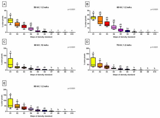 The percentage of color-annotated pixels (%color pixels) for each X-ray tube setting ((A) 50 kV; 1.2 mAs; (B) 60 kV; 1.2 mAs; (C) 60 kV; 12 mAs; (D) 70 kV; 1.2 mAs; (E) 80 kV; 1.2 mAs) compared between steps of the density standard (S1–S10). Boxes represent the lower quartile, median, and upper quartile, whereas whiskers represent minimum and maximum values. Lowercase letters indicate the differences among S1–S10. The significance level was set as p < 0.05.