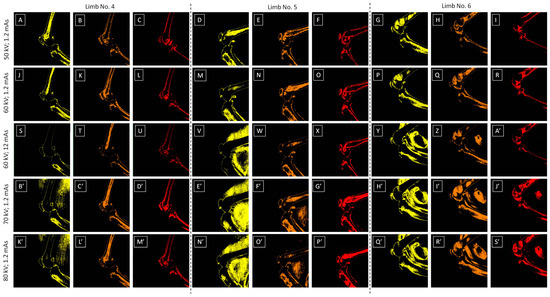 Sample color-annotated images with varying degrees of background artifacts. These images were obtained using the following X-ray tube settings: (A–I) 50 kV; 1.2 mAs, (J–R) 60 kV; 1.2 mAs, (S–A’) 60 kV; 12 mAs, (B’–J’) 70 kV; 1.2 mAs, and (K’–S’) 80 kV; 1.2 mAs. These images were decomposed for the following steps (S1–S3) of the density standard: (A,D,G,J,M,P,S,V,Y,B’,E’,H’,K’,N,Q’) S1, (B,E,H,K,N,Q,T,W,Z,C’,F’,I’,L’,O’,R’) S2, and (C,F,I,L,O,R,U,X,A’,D’,G’,J’,M’,P’,S’) S3. Dashed lines separate image groups of the same limbs: (A–C,J–L,S–U,B’–D’,K’–M’) limb No. 4, (D–F,M–O,V–X,E’–G’,N’–P’) limbs No. 5, and (G–I,P–R,Y–A’,H’–J’,Q’–S’) limbs No. 6, which are characterized by the presence of mild, moderate, and severe background artifacts, respectively.