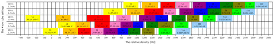 In the plot presented in Figure 7, the relation between %color pixels between X-ray tube settings and ranges of the relative density are summarized for all steps of the density standard. Each colored box on the plot represents the color and HEX code assigned to the consecutive steps of the density standard. The range of each colored box covers the respective range of the relative density and is supported by the %color pixels and the number of occurrences of background artifacts. For 50 kV; 1.2 mAs settings, the ranges of relative density start at approximately 880 HU and cover almost the entire range of relative densities up to approximately 2800 HU, with no background artifacts observed. For 60 kV; 1.2 mAs settings, the ranges of relative density start at approximately 680 HU and end at approximately 2500 HU, also covering almost the entire range of relative densities with no background artifacts. For 60 kV; 12 mAs settings, the ranges of relative density start at approximately −330 HU and end at approximately 2300 HU. However, both scale dispersion and lack of full relative density range coverage and background artifacts are visible. For 70 kV; 1.2 mAs settings, the ranges of relative density start at approximately 90 HU and cover almost the entire range of relative densities up to approximately 2000 HU, with background artifacts. For 80 kV; 1.2 mAs settings, the ranges of relative density start at approximately −100 HU and end at approximately 1800 HU, also covering almost the entire respective range. However, also background artifacts are observed. In this summary, one may observe the shift in color annotations from negative HU values for 60 kV; 12 mAs and 80 kV; 1.2 mAs settings to the highest positive HU values for the 50 kV; 1.2 mAs setting. The coverage of relative density ranges is adjacent for 50 kV–80 kV; 1.2 mAs and increases on the HU scale from 50 kV; 1.2 mAs to 80 kV; 1.2 mAs. For 60 kV; 12 mAs, one can notice a scattering of coverage of relative densities with the successive steps (Figure 7).