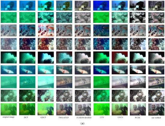 - Xie, J.; Hou, G.; Wang, G.; Pan, Z. A Variational Framework for Underwater Image Dehazing and Deblurring. IEEE Trans. Circuits Syst. Video Technol. 2022, 32, 3514–3526. [Google Scholar] [CrossRef]