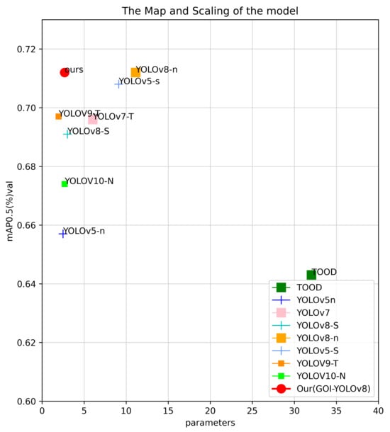 The advantages of incorporating each method into the model and their respective impacts on model performance were evaluated through a series of ablation experiments. As can be seen in Table 5, after using repGFPN, although the Map of our model increases from 69.1% to 70.4%, indicating that it is effective in improving feature fusion by adding layers, it also leads to a 7.6% increase in parameters. After adopting DySample, the Map50-95 is increased from 43.8 to 44.1%, which indicates that the sampling offset method of DySample can obtain more deep information in low-light scenes. After using Gconv, the Map50 is increased from 70.4% to 71.2%, indicating that group convolution can separate the interference information of the detected object edge to improve the detection performance, while the number of parameters decreases from 3.26 m to 2.67 m, leading to comprehensive improvement in various indicators.