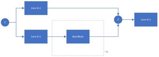 - CSPNet [] is utilized to replace the initial feature fusion based on a 3 × 3 convolution. We employ the cross-stage Partially Dense Network (CSP) in conjunction with GFPN to enhance CSPNet and optimize the neck structure, addressing the issue of low efficiency in cross-scale feature fusion based on convolution within the original architecture. The CSP module is illustrated in Figure 3.