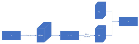 Given an upsampling scale factor s and a feature map X of size, a linear layer with input and output channel numbers C is used to generate the offset O of size, which is then reshaped by Pixel Shuffling []. Then, the sampling set S is the sum of the offset O and the original sampling grid G, i.e.,