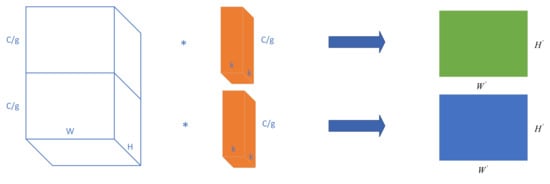 - Group convolution is employed as a substitute for conventional convolution in the detection head, effectively mitigating the blurring of edge information caused by low light conditions. By isolating interference information related to object edges, this approach enhances the compatibility between the model’s detection head and the improved network architecture, thereby contributing to a better balance between real-time performance and model accuracy.