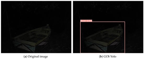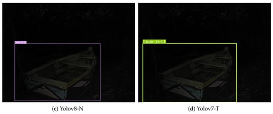 The detection results of the different detectors are visualized in Figure 6. It can be observed that the proposed GOI-YOLO model effectively isolates the influence of edge information in low-light scenes, resulting in more accurate prediction boxes and precise capture of potential object information in low-light images.