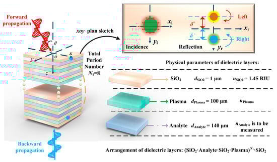 The asymmetric arrangement of the layered metastructure breaks the spatial symmetry, achieving Janus functionality. Figure 1 illustrates the arrangement sequence of the layers in the JBS. The layers of SiO2, Plasma, and Analyte are arranged along the +z-axis in the order (SiO2·Analyte·SiO2·Plasma)N1·SiO2, where N1 = 8 represents the number of periods in the dielectric layers. The entire JBS is placed in the air at an ambient temperature of 300 K to suit typical sensor application scenarios. EMWs incident on the JBS from different directions exhibit different electromagnetic spectra. Forward and backward incidences are indicated by red and blue arrows, respectively, within the xoz-plane. The angle θ denotes the incident angle, which is the angle between the incident EMWs and the z-axis. The upper right corner of Figure 1 shows the process of photonic spin Hall displacement. The glowing spheres on the left and right sides represent the situations when the EMWs are incident and reflected, respectively. xi and yi denote the reference coordinate system for the incident EMWs, while xr and yr denote the reference coordinate system for the reflected EMWs. When a linearly polarized light with an RI gradient reflects on the surface of the structure, it splits into left-handed and right-handed circularly polarized EMWs, with beam displacements denoted as δ+ and δ−, respectively. The beam displacements for vertical and horizontal reflected EMWs are denoted as δV and δH. dSiO2, dPlasma, and dAnalyte represent the thicknesses of each dielectric layer, with dimensions of 1 μm, 100 μm, and 140 μm, respectively. The RI of SiO2 is nSiO2 = 1.45 RIU [43], the RI of Analyte is nAnalyte (to be specified in subsequent sections), and the RI of Plasma is represented as follows [44]: