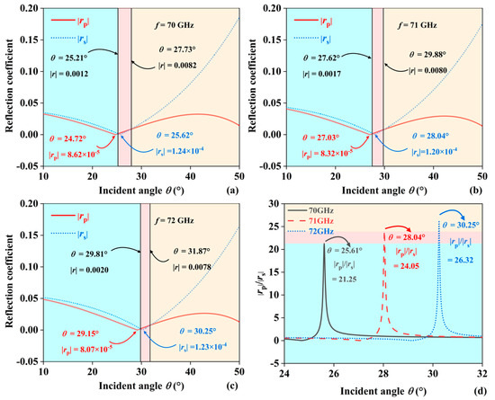 To determine the reflection coefficients of EMWs at different incident frequencies, the optimal peak of δv− was selected to discuss the reflection coefficients for different incident frequencies f. Frequencies of 70, 71, and 72 GHz were chosen with 1 GHz intervals. Since the effective RI of the JBS responds differently to EMWs at different frequencies, the propagation of EMWs is affected [32]. This is reflected in the Fresnel reflection coefficient in Figure 2. Figure 2a–c illustrates the relationship between the Fresnel reflection curves of |rs|and |rp| within an incident angle range of 10° to 50° for different frequencies. |rp| is represented by a red solid line, and |rs| is represented by a blue dashed line. Figure 2a shows the reflection coefficients at an incident EMW frequency of 70 GHz. There are two intersection points in the curves of |rs|and |rp|, at 25.21° (|r| = 0.0012) and 27.73° (|r| = 0.0082). In the ranges of 10° to 25.21° and 27.73° to 50°, |rs| is greater than |rp|, while in the range of 25.21° to 27.73°, |rs| is less than |rp|. The minimum value of |rp| is 8.62 × 10−5, and the minimum value of |rs| is 1.24 × 10−4. Figure 2b shows the reflection coefficients at an incident EMWs frequency of 71 GHz. At 27.62° (|r| = 0.0017) and 29.88° (|r| = 0.0080), |rs| = |rp|. In the ranges of 10° to 27.62° and 29.88° to 50°, |rs| is greater than |rp|, while in the other range, |rs| is less than |rp|. The minimum value of |rp| is 8.32 × 10−5 at an incident angle of 27.03°, and the minimum value of |rs| is 1.2 × 10−4 at an incident angle of 28.04°. Figure 2c shows the reflection coefficients at an incident EMWs frequency of 72 GHz. In the ranges of 10° to 29.81° and 31.87° to 50°, |rs| is greater than |rp|, while in the remaining range, |rs| is less than |rp|. The minimum value of |rp| is 8.07 × 10−5 at an incident angle of 29.15°, and the minimum value of |rs| is 1.23 × 10−4 at an incident angle of 30.25°. According to equation (11), the PSHE displacement δv− mainly depends on the |rp|, |rs| ratio. The larger |rp| and the smaller |rs|, the greater the PSHE displacement. Figure 2d shows the values of |rp|/|rs| at 70, 71, and 72 GHz. At 70 GHz, with θ = 25.61°, the maximum value of |rp|/|rs| is 21.25; at 71 GHz, with θ = 28.04°, the maximum value is 24.05; and at 72 GHz, with θ = 30.25°, the maximum value is 26.32. The value of |rp|/|rs| is an important inducer of the SPHE displacement.