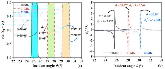 It should be noted that another reason for the enhanced lateral displacement of the JBS is the variation in the phase difference cos(φp − φs) between p − polarized and s − polarized light. Figure 3a shows cos(φp − φs) for different frequencies, revealing that as the frequency increases from 70 GHz to 72 GHz, the range where cos(φp − φs) = 1 gradually shifts to larger angles. When the incident EMWs are at 70 GHz, cos(φp − φs) = 1 in the angular range of 24.68° to 25.66°. For 71 GHz, cos(φp − φs) = 1 in the angular range of 27.03° to 28.05°. For 72 GHz, cos(φp − φs) = 1 in the angular range of 29.14° to 30.26°. The displacement size, δv−/λ, is explained by this variation in Figure 3b. At incident frequencies of 70, 71, and 72 GHz, the maximum values of δv−/λ are 3.492, 3.564, and 3.498, respectively, at angles of 25.64°, 28.07°, and 30.28°.