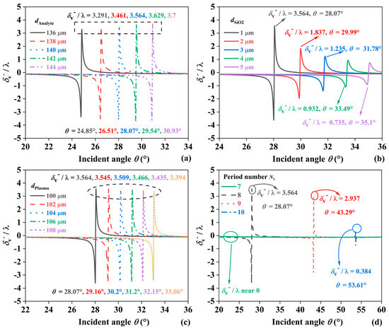 The PSHE phenomenon is excited in a multilayer structure composed of SiO2, Plasma, and Analyte, so the size parameters of these three materials and the number of dielectric periods also affect PSHE. In Figure 4a, dAnalyte represents the thickness parameter of the Analyte layer. Significant differences in the PSHE effect are observed. When dAnalyte is 136 μm, 138 μm, 140 μm, 142 μm, and 144 μm, the maximum PSHE displacements are 3.291λ, 3.461λ, 3.564λ, 3.629λ, and 3.7λ, respectively, with corresponding resonance angles of 28.07°, 29.99°, 31.78°, 33.49°, and 35.1°. This indicates that as the thickness of the Analyte increases, the displacement gradually decreases. Figure 4b illustrates the modulation of PSHE displacements with varying SiO2 thickness. When the thickness of SiO2 rises from 1 μm to 5 μm in increments of 1 μm, the maximum value of δv−/λ gradually reduces from 3.564 to 0.735, and the resonance angle increases. Specifically, the maximum value of δv−/λ occurs, corresponding to a resonance angle of 28.07°, whereas the minimum value of δv−/λ appears, corresponding to a resonance angle of 35.1°. This indicates that variations in SiO2 thickness significantly impact both the PSHE displacement and the associated resonance angle. Figure 4c shows the effect of varying Analyte layer thickness on δv−/λ, with thickness ranging from 100 μm to 108 μm in 2 μm increments. The maximum displacements are 3.564λ, 3.545λ, 3.509λ, 3.466λ, 3.435λ, and 3.394λ, occurring at 28.07°, 29.16°, 30.2°, 31.2°, 32.15°, and 33.06°, respectively. In Figure 4d, when the number of periods N1 is 7, 8, 9, and 10, the displacement is nearly zero at N1 = 7, with the maximum displacement occurring at N1 = 8. For N1 = 9 and N1 = 10, the maximum PSHE displacements are 2.937λ and 0.384λ, with corresponding resonance angles of 43.29° and 53.61°.