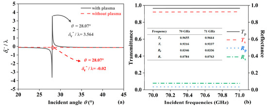 Figure 5a shows the influence of plasma on PSHE displacements within the angular range of 20° to 45°. When the plasma layer is present, the maximum value of δv−/λ is 3.564, and the corresponding angle is 28.07°. When the plasma is absent, at an incident angle of 28.07°, the value of δv−/λ is −0.02. Thus, it can be seen that the presence of plasma guides the propagation of EMWs. By reasonably introducing plasma, δv−/λ can be effectively increased. Figure 5b shows the transmission and reflectance when plasma is present. For the p-polarization and s-polarization, their transmission and reflectivity are expressed as Tp, Ts, Rp and Rs, respectively. When the incident angle is 28.07°, in the range of 70 ~ 71 GHz, the transmittance of p-polarization and s-polarization are greater than 0.9, and the transmittance of p-polarization is greater than that of s-polarization. At this time, the transmittance of p-polarization at 70 GHz and 71 GHz are 0.9655 and 0.9664, respectively. And at this time, the reflectivity levels are all lower than 0.1. The reflectivity of p-polarization is less than that of s-polarization. The reflectivity under s-polarization at 70 GHz and 71 GHz are 0.0784 and 0.0763, respectively. From the above analysis, it is clear that structural parameters and material design affect the light path distribution of EMWs in the JBS, thereby causing shifts in displacement and angles. This provides a theoretical basis for arbitrary control of PSHE and increases the potential for practical applications.