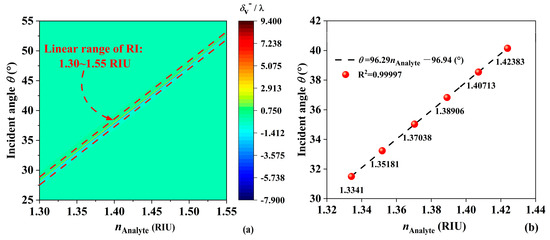 When EMWs are incident at a frequency of 71 GHz, different frequency characteristics are observed for forward and backward propagation. Figure 6a shows the relationship between the RI of the analyte and the PSHE displacement when the wave is incident at various angles. As the nAnalyte increases from 1.3 RIU to 1.55 RIU, the incident angle also increases. Using the maximum δv−/λ as the criterion, a linear relationship is observed between the incident angle and the nAnalyte, with a detection range for RI from 1.3 RIU to 1.55 RIU. At nAnalyte = 1.3341 RIU, the angle is 31.5°, with δv−/λ of 4.854. As the nAnalyte increases, δv−/λ gradually increases, reaching 8.022 at nAnalyte = 1.42383 RIU, with a corresponding angle of 40.15°. The specific detection parameters are shown in Table 2. Figure 6b describes the linear range of the incident angle with respect to nAnalyte, with the fitting equation θ = 96.29nAnalyte − 96.94°, and R2 = 0.99997. The value of R2 approaching 1 indicates a good-fitting result [28]. In addition, the detection of protein concentration in aqueous solutions is beneficial for the quantitative study of protein levels and plays a crucial role in disease diagnosis. In fact, the refractive index of proteins is also related to the working frequency band of the sensor, ambient temperature, and acidity and alkalinity. However, when these limitations are ignored and the RI of proteins is assumed to be constant, the refractive index data in Table 2 correspond to protein aqueous solutions with concentrations of 0 to 50 nmol/L (concentration interval is 10 nmol/L) [17,22], and the designed JBS has potential value in protein detection.