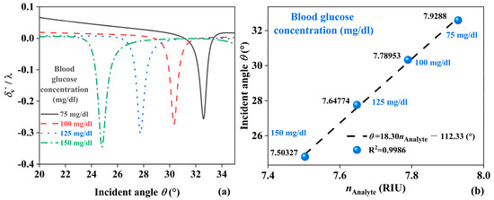 Figure 7a shows the detection of changes in nAnalyte when EMWs are incident from the reverse direction. It displays how δv−/λ varies as the relative permittivity of the analyte changes from 62.8658 to 56.299, with incident angles ranging from 20° to 35°. Table 3 shows the detection of JBS for blood glucose concentration [45,46]. The minimum values of δv−/λ occur at angles of 32.59°, 30.33°, 27.76°, and 24.8°. As the relative permittivity of the analyte increases, the incident angle also increases. Using the minimum δv−/λ as the criterion, a linear relationship is observed between the incident angle and nAnalyte. Since different blood glucose concentrations correspond to different dielectric constants, by measuring the refractive index under different blood glucose concentrations, the minimum δv−/λ will show a significant difference. In the blood glucose concentration range of 75 mg/dL to 150 mg/dL, Figure 7b describes the linear range of the incident angle with respect to blood glucose concentration, with the fitting equation θ = 18.30 nAnalyte − 112.33°, and R² = 0.9986. This indicates a 99.86% confidence level in the linear relationship between the incident angle and nAnalyte, validating the feasibility of the biosensor for blood glucose concentration detection.