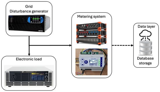 The dataset was created using a programmable AC power source that was used to simulate the behavior of the grid. Indeed, it is possible to replicate disturbances inside the grid using such equipment, emulating a realistic scenario in a controlled environment. Using the electronic regenerative load, it was possible to simulate the behavior of different kinds of loads and scenarios, such as inductive or capacitive, distorted, and unbalanced loads. The monitoring and acquisition of the electrical power signal was done by dedicated instrumentation that allows for real-time data collection and analysis, helping to identify potential problems or issues in power systems and ensuring optimal performance and efficiency. A custom-made sensing device has been developed with the aim of measuring and recording voltage and current signals in a five-wire, three-phase system (i.e., phase L1, phase L2, phase L3, neutral wire, and ground wire). A deeper description of the custom measurement unit is provided in [25]. The correct monitoring of the electrical parameters using the proposed PQ meter could allow detection of unexpected failures and improve the energy efficiency of the power supplier. All the information captured by the different sensors in the devices was stored in a cloud-based database. The whole dataset is composed of a matrix of 64 columns by 28,000 rows, having a total size of 14.1 megabytes (Mb). This dataset could be considered a time series because it is composed of observations or data points collected sequentially over time. Each data point is associated with a specific timestamp, allowing for the analysis of trends, seasonal patterns, and correlations over time. A commercial PQ instrument by Dewesoft Sirius Modular Data Acquisition System (Dewesoft, Trbovlje, Slovenia) has also been used to check and validate the data acquired by the custom-made sensing device. The complete experimental platform used to generate the experimental datasets is shown in Figure 1.