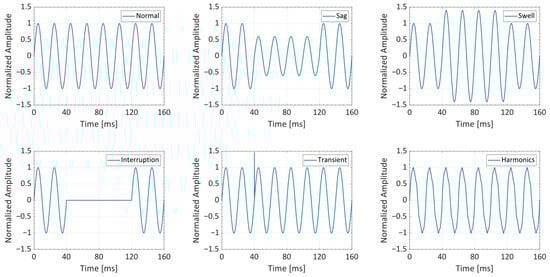 The disturbances that are included in the dataset are sag, swell, interruption, transient, and harmonics as defined in the IEEE recommended practice for monitoring electric PQ standard [4]. A sag is defined as a short duration decrease in voltage or current levels, typically lasting from a few cycles to a few seconds. It is defined as a decrease of voltage or current between 10% and 90% of the nominal voltage. Quite the opposite, a swell is a short increase (more than 10% of the nominal value) in voltage or current, lasting from a few cycles to a few seconds. A voltage interruption refers to a complete loss of voltage or current for a specified duration, typically lasting from a few milliseconds to several minutes. Transients are short, high-frequency voltage spikes or surges in electrical systems, typically lasting for a very short duration of microseconds to a few milliseconds. Harmonics happen in the presence of one or more sinusoidal harmonics at frequencies that are integer multiples of the fundamental frequency (typically 50 Hz or 60 Hz), which can distort the waveform. All the previous disturbances are shown in Figure 2.
