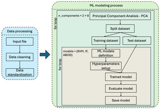The initial stage of the process focuses on data processing, which is illustrated in the left part of Figure 3. During this stage, the significant task of refining the dataset by eliminating certain columns that were unnecessary for the analytical objectives was executed, and the final dataset included 52 features. This step is crucial to enhancing the efficiency and clarity of the data that were used. Additionally, it was necessary to change the data types of several columns to ensure that they were appropriate for the operations we intended to perform. This transformation is vital for maintaining the integrity of the analysis and for facilitating seamless data manipulations thereafter. Finally, a reset of the index of the dataframe was executed, which is an important step to streamline the dataset and prepare it for subsequent processing and analysis.