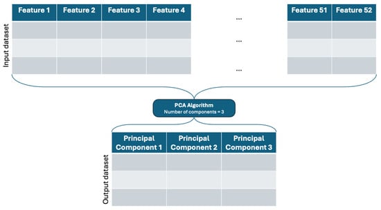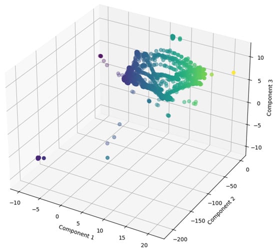 The result of the standardization step is the input of the Principal Component Analysis (PCA). The PCA technique was introduced by Harold Hotelling in [26]. Nowadays, PCA is a widely used statistical technique for dimensionality reduction and has various applications across numerous fields such as dsata visualization, face recognition, image compression, preprocessing for machine learning, and anomaly detection. This work is used as a dimensionality feature reduction, which simplifies the analysis and interpretation of the dataset. By transforming the data into a new coordinate system, PCA helps in identifying key patterns and features while reducing the number of dimensions without losing much information. The original dataset has 64 features, and in each feature is data of different types, such as string, datetime, integers, or decimals. The input dataset of the PCA algorithm is composed of 52 features, as was mentioned before in the explanation of the data processing pipeline, and is shown in Figure 4. This figure is reduced to 3 components for the graphic understanding, but it was tested during the training and testing phases using different numbers of components, as explained below.