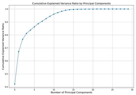 One of the PCA’s algorithm hyperparameters is the number of Principal Components (PCs) to which the user wants to reduce the dimensionality of the input dataset. Each PC corresponds to a certain amount of variance in the data; this is called explained variance. The first PC captures the largest portion of the variance, the second captures the second largest portion, and so on. Also, it is important to know that each PC has an associated eigenvalue, which quantifies the amount of variance carried by that component. The eigenvalues are derived from the covariance matrix of the data. Figure 6 graphically represents the behavior of the variance ratio applied to our dataset. In this figure, it is possible to appreciate that, when reduced to 15 PCs, the explanation of the dataset was totally included without any loss of information. This graph displays the proportion of the total variance explained by each PC. The x-axis represents the principal components, while the y-axis shows the variance ratio (eigenvalues) for each component. A key aspect of interpreting this graph is identifying the “elbow”, where the amount of additional variance explained by subsequent components begins to level off. This point indicates the optimal number of principal components to retain for capturing most of the variance in the data, balancing dimensionality reduction with information retention. A sharp drop in variance after certain components suggests that those primary components capture most of the essential information in the dataset. Also, in this figure it is possible to see the cumulative explained variance ratio, which is the running total of the explained variances. Basically, it gives a holistic view of how much of the total variance is explained, including more PCs. In this research, the number of PCs went from 2 up to 8 PCs in the output. With 2 PCs, it explains almost 80% of the data, with 3 it explains 82%, and so on. 8 PCs explain almost 92%, so the algorithm iterates over these PCs to get the best results with the developed experimental dataset.