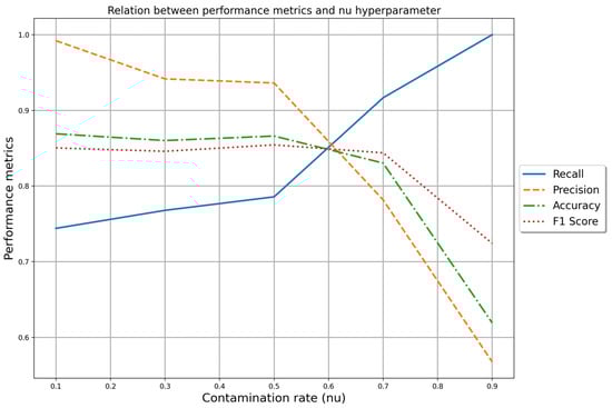 After the execution of all scenarios was performed, an analysis of the results from the best model, OCSVM, revealed a relationship between the “nu” hyperparameter and the performance metrics, as shown in Figure 9. The “nu” hyperparameter serves as a regularization term that balances the trade-off between the model’s complexity and its ability to identify outliers. Specifically, “nu” defines an upper bound on the fraction of training errors (points that do not belong to the target class) and a lower bound on the fraction of support vectors used in the model. The relation was that when the “nu” increases, the recall metric also increases, but the other metrics start to decrease. It happens when the decision threshold of your model is adjusted to increase recall (i.e., you make the model more compliant in predicting positive instances), and you often capture more TP.